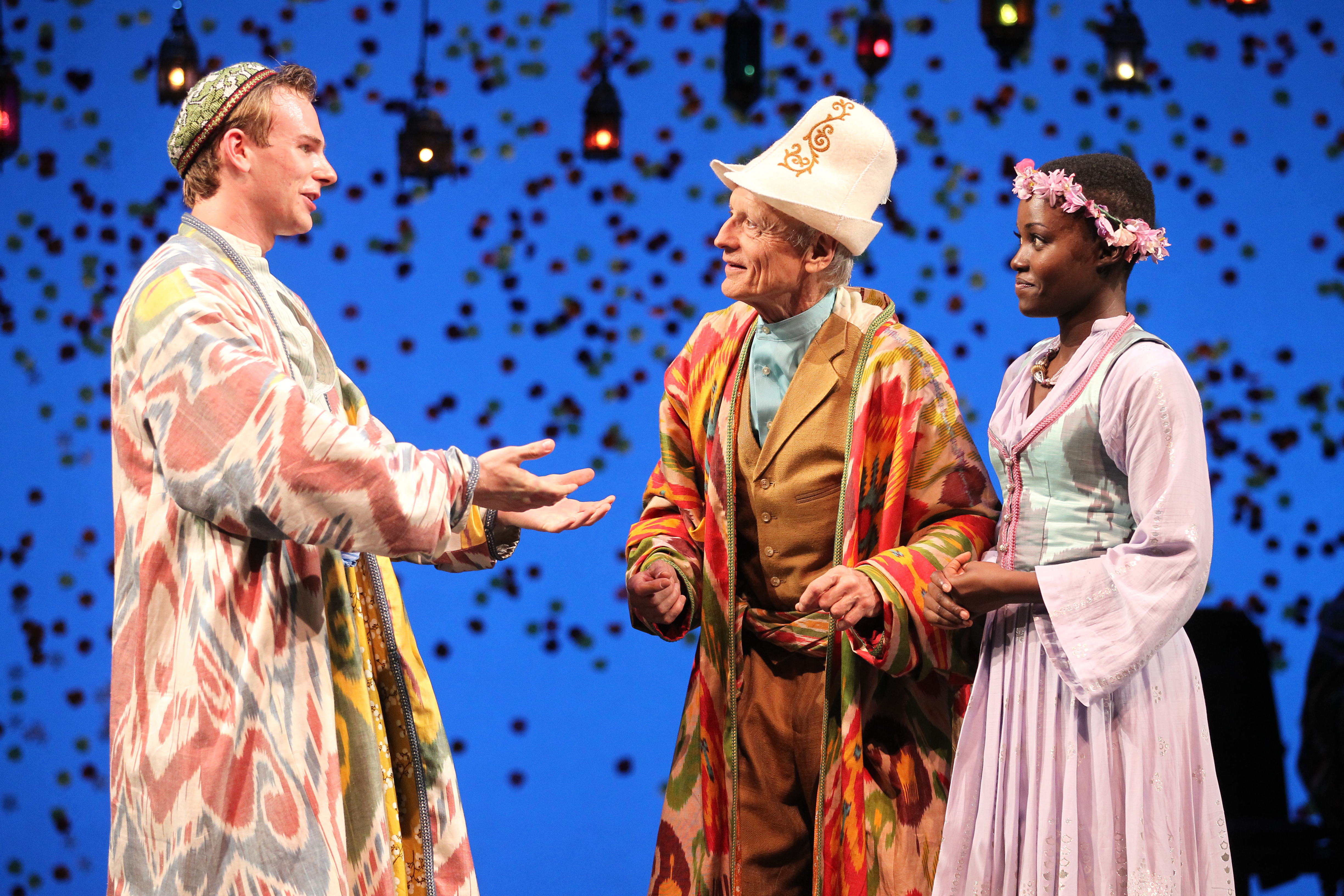 Old Shepherd Thomas Kopache flanked by Tim Brown as Florizel and Lupita Nyong'o as Perdita in The Winter's Tale at Yale Rep. Photo by Joan Marcus.