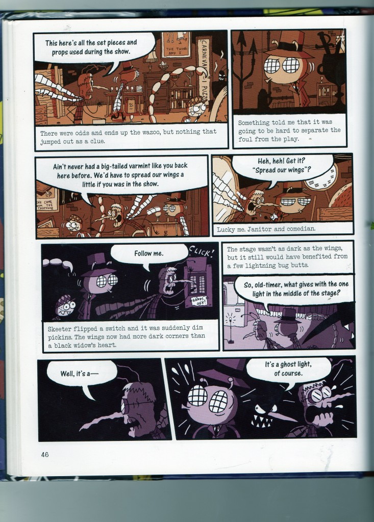 Insect noir adventure in which a private eye who has the compound eyes of a fly and who is a magnet for atrocious puns (“I do believe your fly is down.” “So I was.”) solves a crime in an old playhouse. The plot hinges on quaint theatrical superstitions and devices, and comes off pretty knowledgeable about the field. At 128 pages and averaging seven cartoon panels to a page, this is pretty dense for a kid’s graphic novel. So don’t share it with them. (My own daughters, who are 7 and 9 and widely read, found it “creepy”). A good gift for theater pests of most any other age.