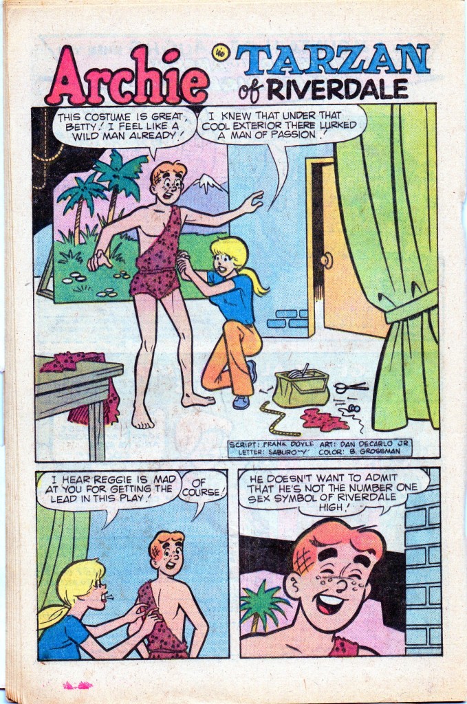 How daring of the Riverdale High School drama club to be staging a Tarzan drama 25 years before the Disney Broadway version. This story appears in Archie Giant Series Magazine #504, March 1981. The animated Disney movie which begat the Broadway show was released in 1999. There is a Tarzan stage legacy dating back to the early 1920s, nine years after Edgar Rice Burroughs’ first Tarzan novel was published.