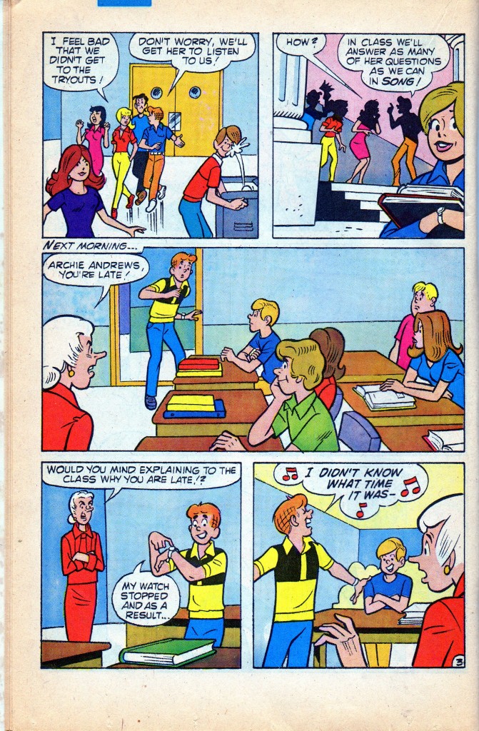 From Everything’s Archie #132, November 1987. Script bny Jim Ruth, pencilling by Bob Bolling, inking by Chic Stone.