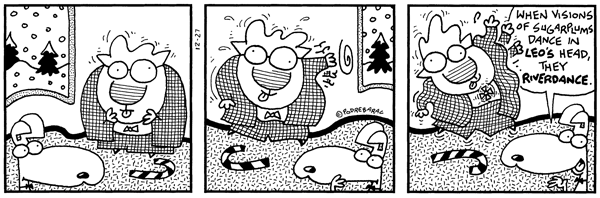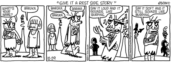 Showtune and bloated dance spectacle references from recent installments of Charlie Podrebarac’s Fat Cats, Paul Gilligan’s Pooch Cafe and Eric Scott’s Back in the Day. Found on the comic strip trove gocomics.com.