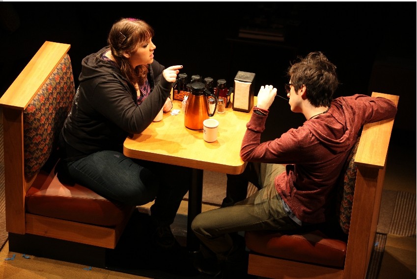 It’s a snapshot of the interlocking events of three separate couples in Pasadena, culminating in one big night. Nance (Kate Eastwood Norris, who telegraphs stressed-out modern woman with her every sigh) and Tom (Alex Moggridge, a reliable everyman whom Connecticut theatergoers know for his recent turns in the Jimmy Stewart role in It’s a Wonderful Life at Long Wharf and brother Andrei in Sarah Ruhl’s version of Chekhov’s Three Sisters at Yale Rep) are on a blind date. Nance has just come from work, interviewing a couple (tightly-wound, immaculately dressed Kate Arrington and Mike DiSalvo) about their desire to adopt a child. Nance’s daughter Evie (Sarah Grodsky), meanwhile, is preparing for a night out on the town with her platonic BFF Colin (Jordan Brodess), who’s pining for his girlfriend back in New Hampshire. The encounters veer from the archly comic to the crass and pitiable.
