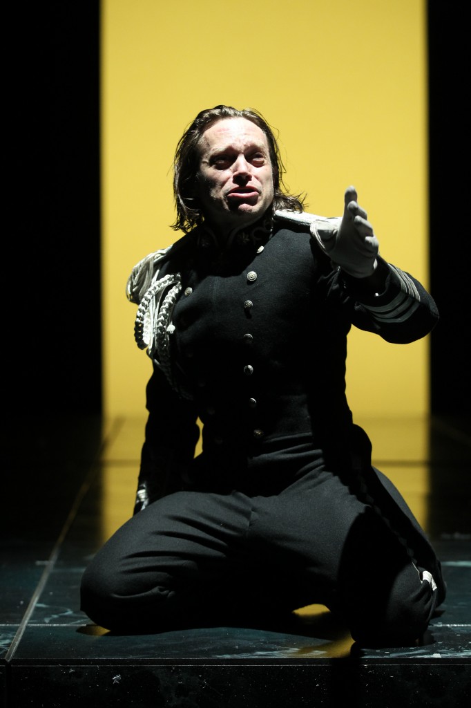The mannered elders and the impetuous youth march around Michael Yeargan’s massive sets of curtains and stairs and thresholds, soundtracked by that neoclassical trio of musicians, as if they each own the place and don’t quite know what to do with it. The scene is perpetually set for revolution, and it happens.