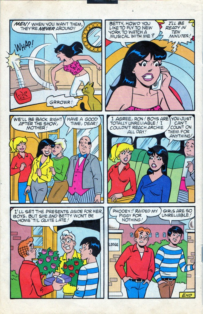 What we need in the American theater is more impulse decisions like in panel two of this story from Veronica comics #145 (December 2003). The story is scripted by Kathleen Webb, pencilled by Dan Parent and inked by Jon D’Agostino.