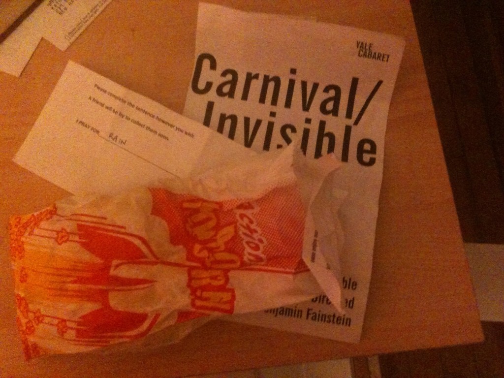 The late Thursday night performance of Carnival/Invisible was particularly enlightening because it behaved so much like a true tent show of a century ago. The audience was volatile—generally respectful, but vocal and abrasive. The show followed a ceremonial changing-of-the-guard at the Yale Cabaret, with the just-announced slate of artistic and managing directors toasting the current holders of those positions on the “YSD Night” performance of the last Cabaret show of this school year. Much beer and wine and bourbon had been consumed at a party just before the performance. The merriment surrounding the ceremony, which involved Yale School of Drama Dean James Bundy in a fireman’s outfit, would not subside. The show’s interlocutor, Barker Masterful Majestic played by Merlin Huff, maintained imperturbable cool but also withdrew the promise of one sensitive scene because “Unfortunately, ladies and gentlemen, you are too unruly.”